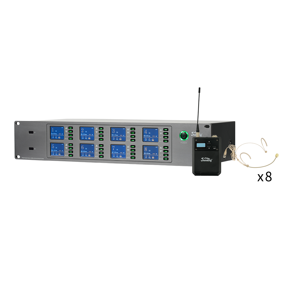 1. 一臺八通道無線麥克風收發主機和8臺腰包式發射器組成的麥克風系統;