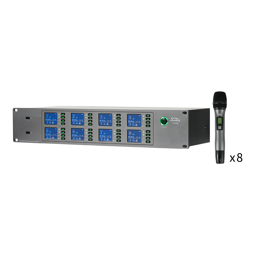 1. 一臺八通道無線麥克風收發主機和8臺無線手持發射機組成的麥克風系統;