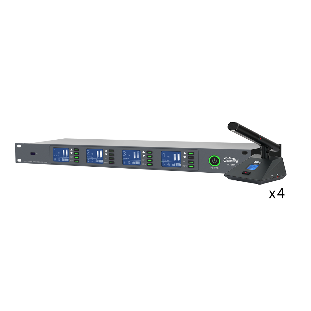 1. 一臺(tái)四通道無線麥克風(fēng)收發(fā)主機(jī)和4臺(tái)桌面會(huì)議式發(fā)射器組成的麥克風(fēng)系統(tǒng);