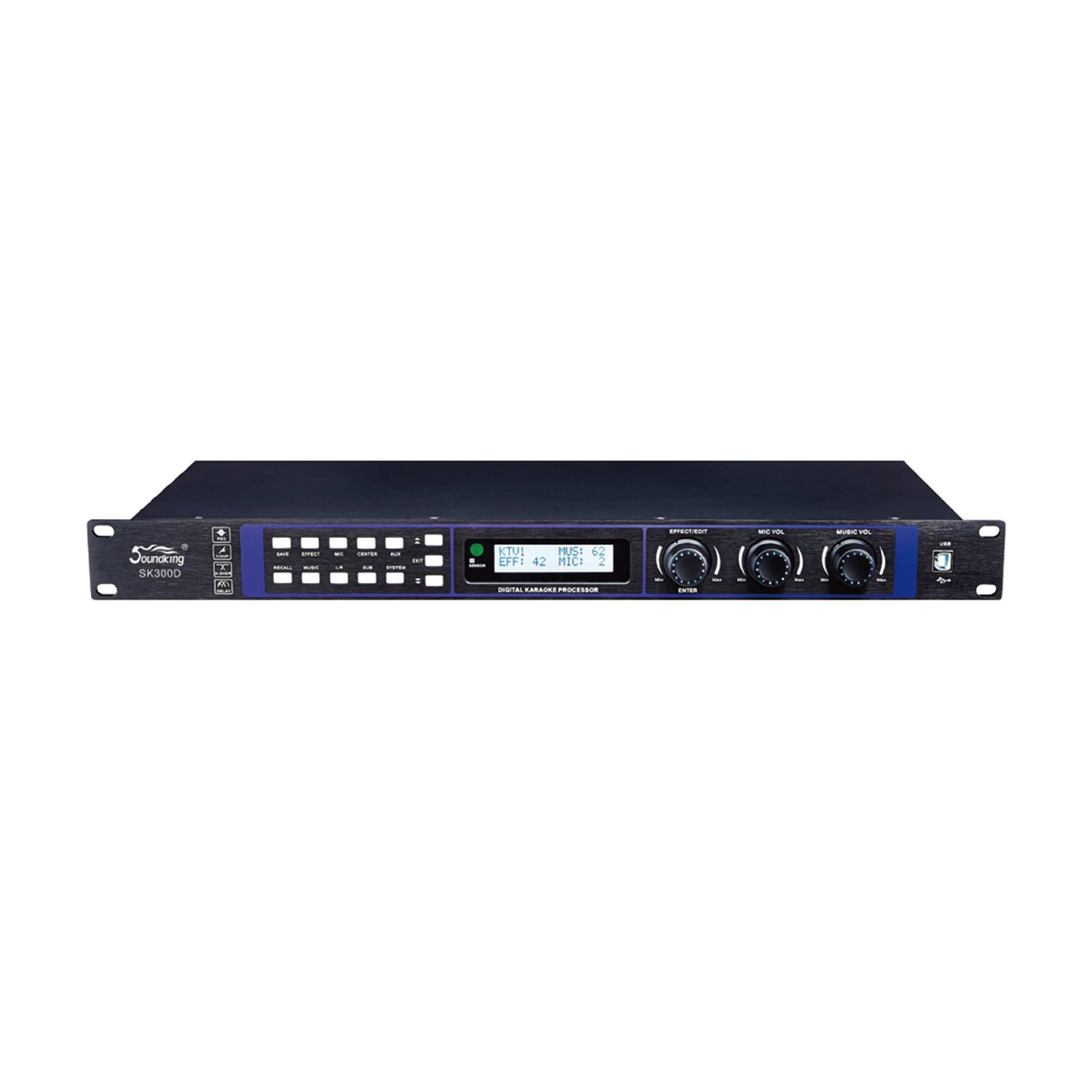 具有音箱處理器功能的卡拉OK效果器,MUSIC輸入通道設有7段參量均衡,MIC輸入通道設有15段參量均衡。主輸出設有5段參量均衡,中置輸出、后置輸出及超低音均設有3段參量均衡,麥克風有3級反饋抑制,可存儲16種模式,主輸出、中置輸出、超低音輸出、后置輸出均設有壓限及延時功能。每個功能部分都獨立可調,目有相應的PC界面,可直觀調節,易于操作,使調音師快速了解功能和使用方法,使演唱者輕松,舒適感覺。