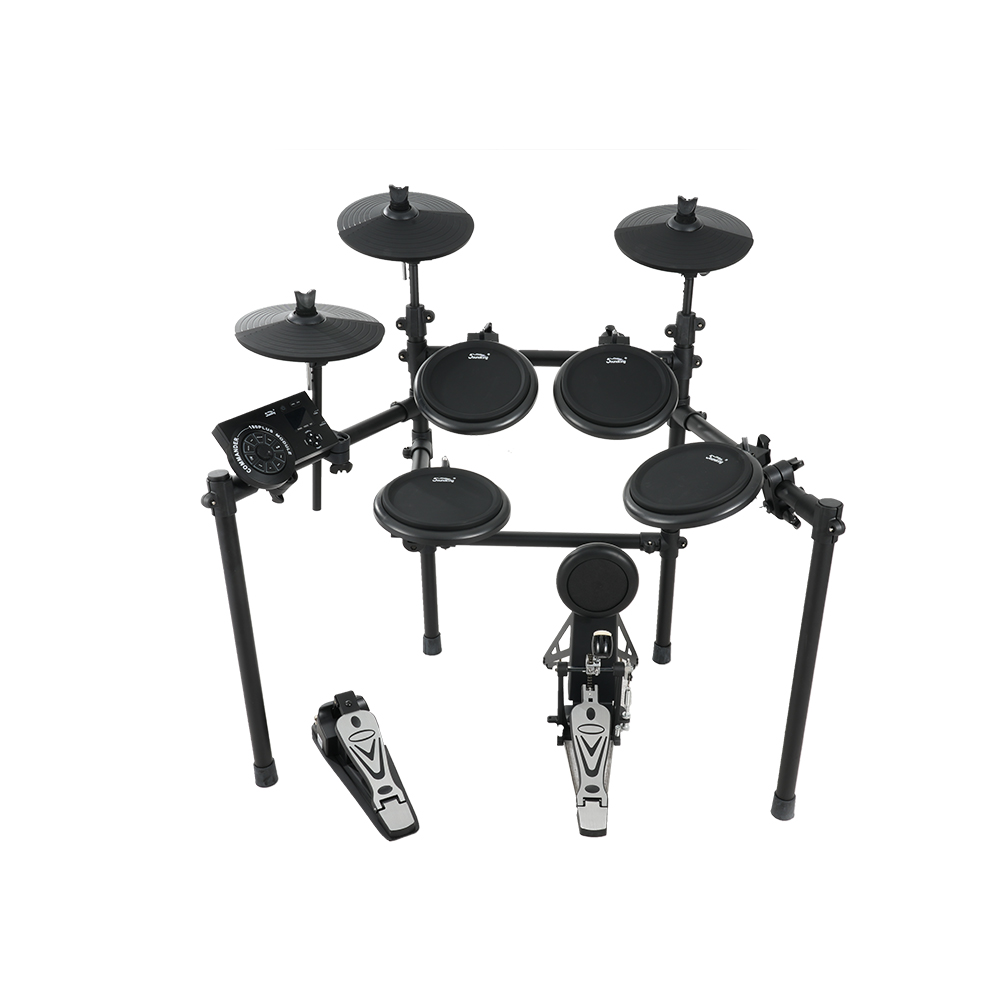 標準配置: 5個鼓盤+3個鈸釵+踩镲控制盒: KICK, SNARE, TOM1, TOM2, TOM3, RIDE, CRASH, HI-HAT, HIHAT CONTROL,支持拓展CRASH2和TOM4,能滿足專業人士演出的各類需求。