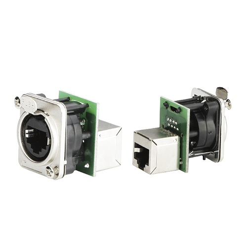 RJ45網絡直通轉換插座,采用高強度鋅合金材質堅固耐用, 鍍金觸點高傳導耐腐蝕,具有機殼接地,帶鎖定功能不易拔出,雙面直插的方式讓信號連接更簡便,標準的D型法蘭通用尺寸適合工程安裝。