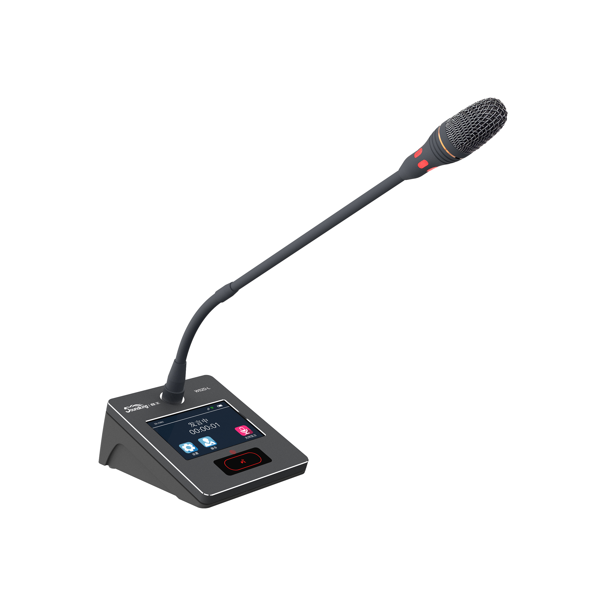 3. 紅綠雙色霧面指示燈設計,指示發言狀態。當紅色燈環亮時,表示正在發言,當綠色燈環亮時,表示申請等待發言